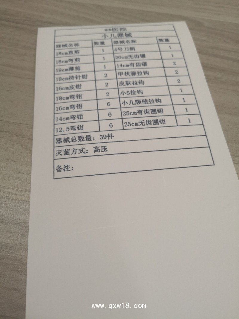 1、在-70-200℃溫度下保持韌性,甚至在長期接觸工作環(huán)境或環(huán)境快速變化時韌性也不受影響。而其他材料可能在低溫條件下碎裂,或者高溫條件下熔化。與殺菌技術(shù)兼容,如耐用型無菌手術(shù)包物料清單,打印文字在經(jīng)過高溫140℃長時間消毒后,再通過90℃高溫清潔機兩小時清洗后,文字內(nèi)容仍保持清晰完整,可達到醫(yī)院消毒滅菌標(biāo)準(zhǔn),避免細(xì)菌二次感染,并可以多次循環(huán)使用,可以在材料上手寫,降低一次性使用成本。