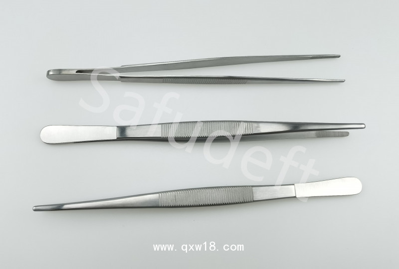 敷料鑷 ,也稱無齒鑷或平鑷,頂端無鉤但有唇頭齒。對組織損傷較小,用于夾持脆弱的組織、臟器,也用于夾持縫針及敷料等。