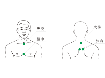 【使用方法】1、貼于肺俞穴和大椎穴,先用溫濕毛巾擦洗穴位周圍皮膚。拆封后慢慢將保護(hù)層揭下,將其貼于穴位之上。癥狀較重患者可加貼天突穴、膻中穴,或遵醫(yī)囑。(見穴位示意圖)