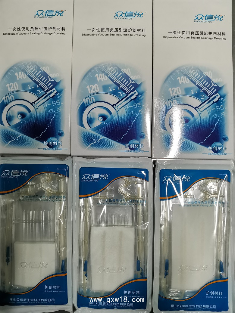 產(chǎn)品用途:一次性使用負(fù)壓封閉引流護(hù)創(chuàng)材料是在引流管外用負(fù)壓引流管醫(yī)用泡沫包裹,是泡沫材料成為引流管和被引流腔隙或創(chuàng)面間的中介,引流管外接沖洗管路,再利用具有生物閥功能的半透性粘貼薄膜封閉被引流區(qū),使之與外界隔絕,接通高負(fù)電源,形成一個(gè)高效引流系統(tǒng),及時(shí)清理被引流區(qū)的滲出物。