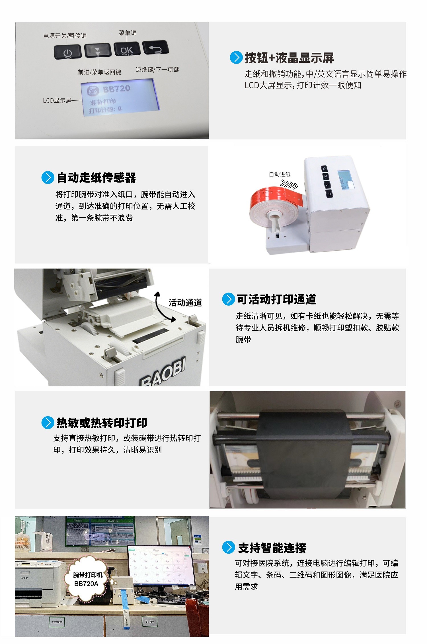 條碼腕帶打印機(jī)BB720A只有普通臺(tái)式打印機(jī)體積的一半大小,不占用位置,支持智能連接,打印腕帶快速清晰。