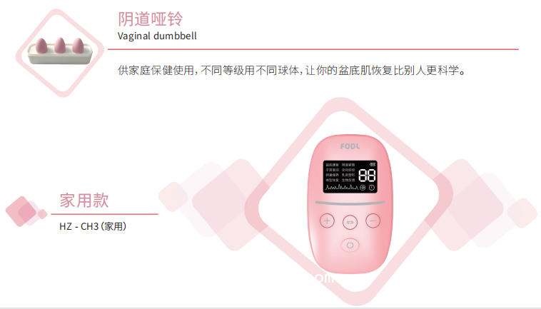 根據(jù)盆底肌修復、盆底功能障礙性疾病(FPFD)(盆底功能障礙性疾病主要包括:盆底臟器脫垂(POP)、壓力性尿失禁(SIU)、糞失禁(FI)、性功能障礙(SFD))、產(chǎn)后排尿、產(chǎn)后催乳、產(chǎn)后恢復等不同的產(chǎn)后問題,特設置了與其配備的智能模式,產(chǎn)品獲得多項國家專利(包括配套的治療棒)。