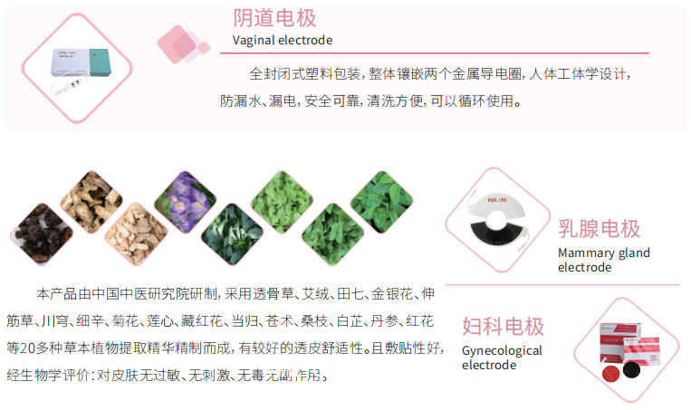 乳腺/婦科電極:本產(chǎn)品由中國中醫(yī)研究院研制,采用透骨草、艾絨、田七、金銀花、伸筋草、川穹、細辛、菊花、蓮心、藏紅花、當歸、蒼術、桑枝、白芷、丹參、紅花等20多種草本植物提取精華精制而成,有較好的透皮舒適性。且敷貼性好,經(jīng)生物學評價:對皮膚無過敏、無刺激、無毒。