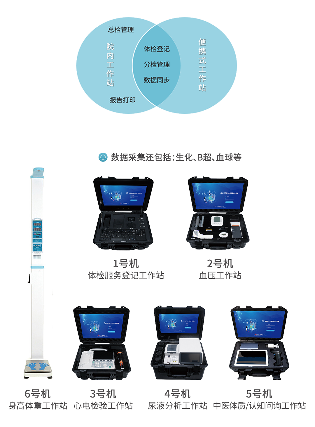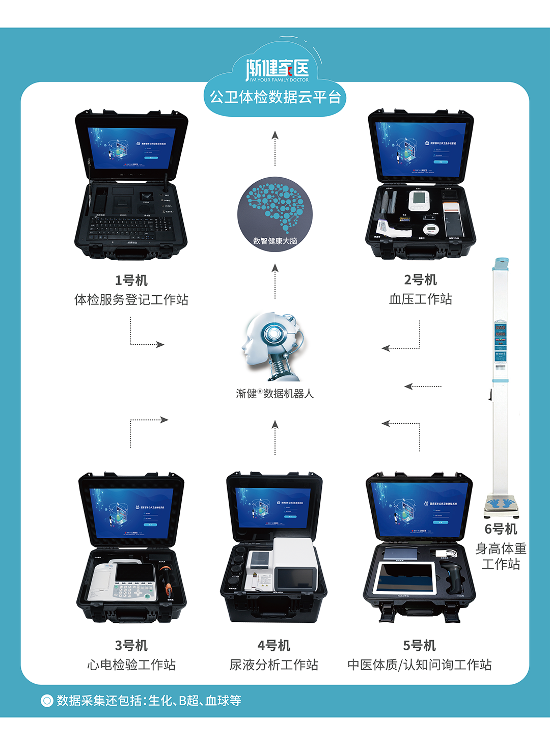 院內(nèi)工作站主要應(yīng)用于院內(nèi)集中式、流水線服務(wù)場(chǎng)景。基于標(biāo)準(zhǔn)部署的“數(shù)字硬件+操作系統(tǒng)”智能一體化方案以及自主專利技術(shù)——漸健?數(shù)據(jù)機(jī)器人能力,支持多區(qū)域同步工作及多人同時(shí)檢測(cè),服務(wù)現(xiàn)場(chǎng)高效有序;數(shù)據(jù)自動(dòng)采集、傳輸、處理,報(bào)告隨檢隨出,全程基本實(shí)現(xiàn)自動(dòng)化、無(wú)紙化、無(wú)人工介入。為醫(yī)務(wù)人員有效減負(fù)的同時(shí),還能提供更精準(zhǔn)、更智能的健康服務(wù),大幅提升公衛(wèi)體檢服務(wù)的覆蓋率、管理率以及居民滿意度等關(guān)鍵指標(biāo)。其中,數(shù)字硬件系列采用多功能集成一體化設(shè)計(jì),無(wú)線連接,易攜帶、收納。
