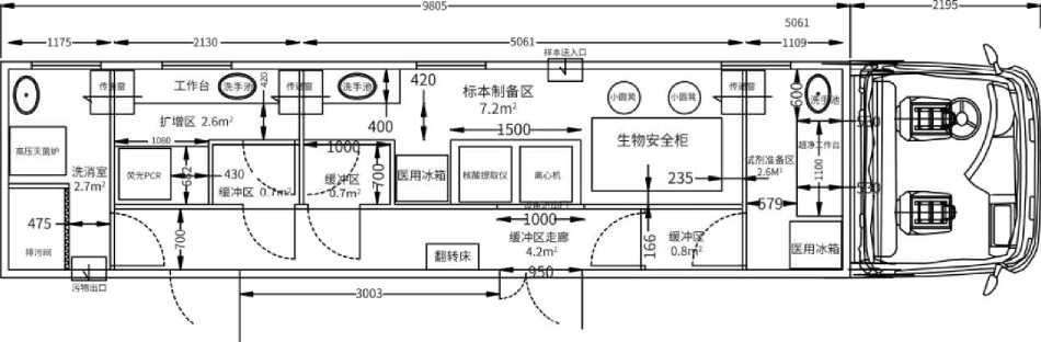 依據(jù)新冠核酸檢測實驗室的要求和臨床基因擴增檢驗實驗室區(qū)域設(shè)計原則,醫(yī)療大巴自動化新冠核酸檢測醫(yī)療室設(shè)置以下區(qū)域:試劑準備區(qū)、標本制備區(qū)、擴增區(qū)。醫(yī)療室整體達到加強型二級生物安全實驗室標準,確保醫(yī)療室工作人員的安全。同時預(yù)留“平戰(zhàn)結(jié)合”的擴展能力,以便醫(yī)療室在非疫情期間同樣可以適用于其他類型的核酸檢測和基因測序工作。