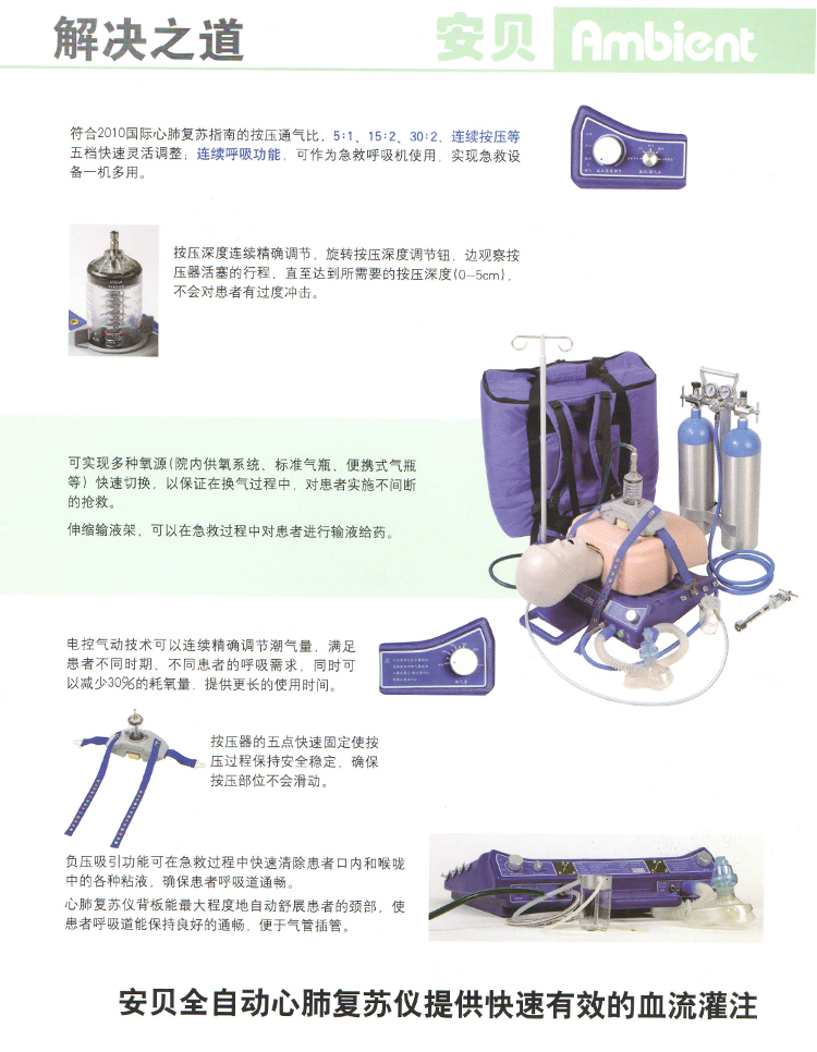 詳細(xì)介紹:1、集同步胸外按壓、間歇正壓通氣、吸痰、給氧、輸液功能于一體2、移動、攜帶方便快捷,適合院前急救、院內(nèi)搶救3、人機(jī)工程學(xué)設(shè)計,主機(jī)背板設(shè)計科學(xué)合理,開 放呼吸道簡單快捷,胸 部固定器可根據(jù)病人體型適當(dāng)調(diào)整和固定4、啟動迅速,10秒鐘內(nèi)能夠快速啟動心肺復(fù)蘇機(jī),對搶救病人及時準(zhǔn)確5、配置齊全,功能強(qiáng)大,給氧給藥、胸外按壓、吸引集中設(shè)計,為心肺復(fù)蘇提供可靠措施