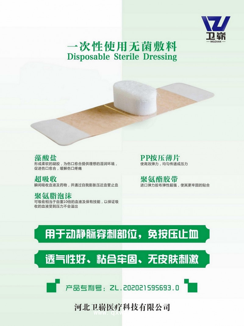 主要適用于供手術(shù)、外傷創(chuàng)面或留置動、靜脈導(dǎo)管貼敷用和嬰兒臍帶創(chuàng)面保護(hù)。廣泛用于動脈穿刺術(shù)后、動脈采血及動脈造影、透析等術(shù)后動脈穿刺點(diǎn)止血或PICC導(dǎo)管穿刺點(diǎn)止血。