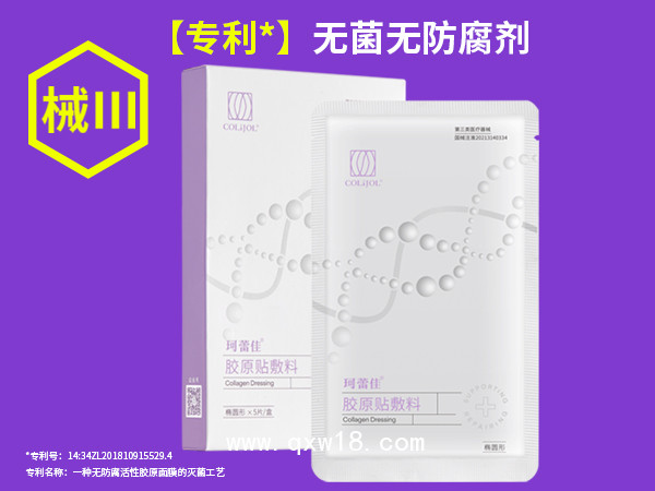 使用方法:清潔患處皮膚,取膠原貼敷料敷患處,將袋內(nèi)膠原蛋白原液擠出后均勻涂抹于敷料表面,每天使用1次,每次20±5分鐘,連續(xù)使用1周,然后每周使用2~3次,兩周為一個療程。