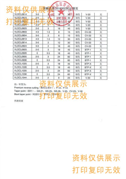 型號:VLOCL0604 規(guī)格:常規(guī)規(guī)格3-0,公制規(guī)格2,長度6",長度15cm,綠色,單針V-20,針尾直徑0.711mm,12根/盒