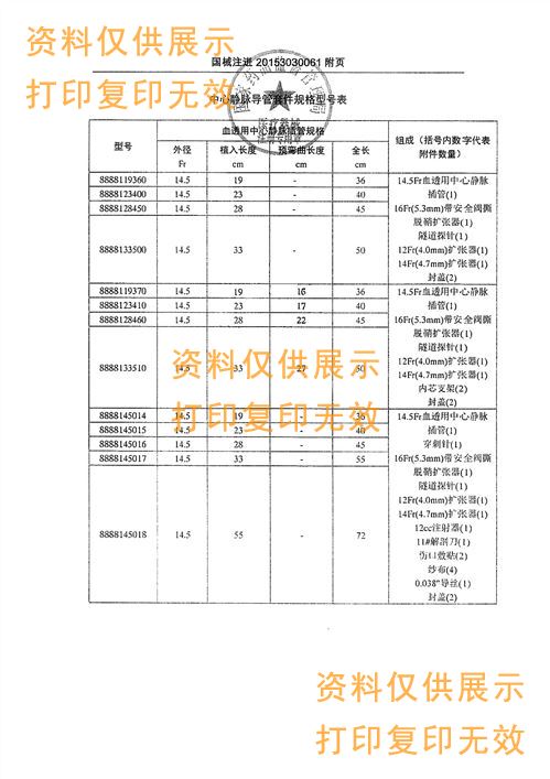?本產(chǎn)品包括:血透用中心靜脈插管、導(dǎo)絲、擴(kuò)張器、穿刺針、隧道探針、傷口敷貼、注射器、封蓋、解剖刀等(詳見附頁(yè))。血透用中心靜脈插管管體采用聚氨酯制成;導(dǎo)絲和穿刺針由304不銹鋼制成;隧道探針由303不銹鋼制成;擴(kuò)張器采用高密度聚乙烯材料;傷口敷貼由聚酯薄膜和棉線制成。產(chǎn)品為一次性使用,環(huán)氧乙烷滅菌。留置中心靜脈后可持久使用(可大于30天)