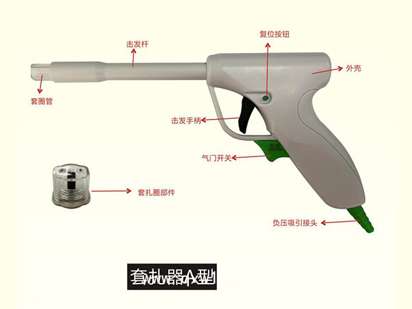[產品結構]本產品由套扎圈部件(或彈力線部件)、套圈管、擊發(fā)桿、擊發(fā)手柄、復位按鈕、負壓吸引接頭、外殼、氣門開關組成,附件為推圈器、套圈器、窺視套和肛塞。