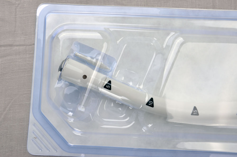 該產(chǎn)品主要由器身、握把、旋轉(zhuǎn)尾翼、釘匣、釘砧和穿刺器構(gòu)成??p釘材質(zhì)為鈦,器械桿材質(zhì)為301不銹鋼,切刀材質(zhì)為410不銹鋼,穿刺器和握把材質(zhì)為聚碳酸酯。