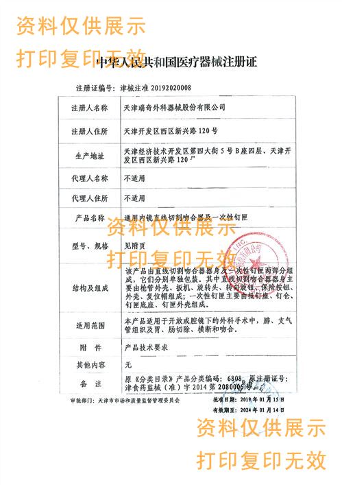 注冊(cè)證名稱:通用內(nèi)鏡直線切割吻合器及一次性釘匣