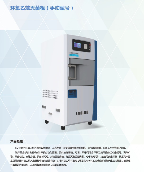 SQ-XH系列環(huán)氧乙烷滅菌柜設計精良,工藝考究,主要由微電腦控制系統(tǒng)、殘氣處理裝置、滅菌工作室等部分組成。