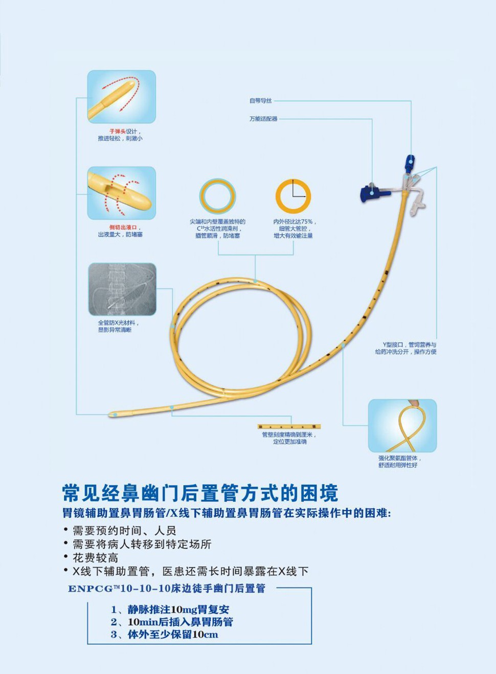 便捷:床邊徒手置管,醫(yī)生護(hù)士均可輕松操作;無需移動(dòng)患者,無需預(yù)約胃鏡或X光室。