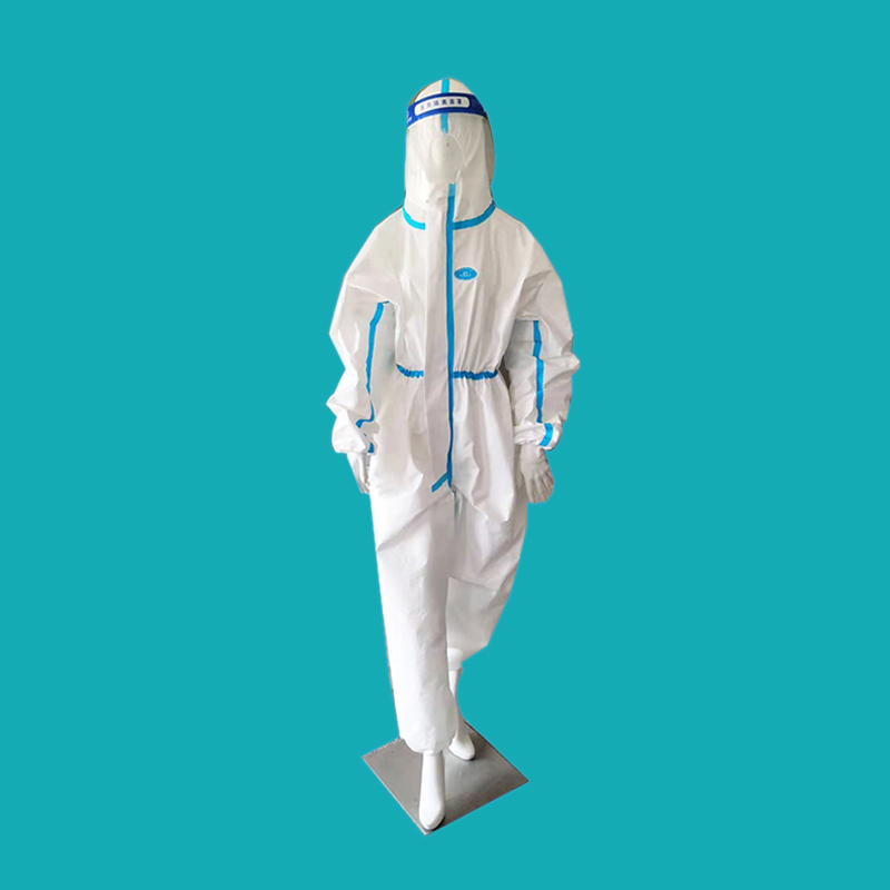 【結(jié)構(gòu)及組成】:本產(chǎn)品由復(fù)聚乙烯膜的聚丙烯無(wú)紡布加工制成。由連帽上衣、褲子組成。