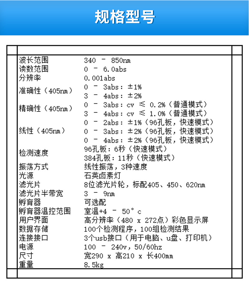 精確性(405nm):CV≤0.2%(0-3Abs),CV≤1.0%(3-4Abs),標(biāo)準(zhǔn)測(cè)量模式