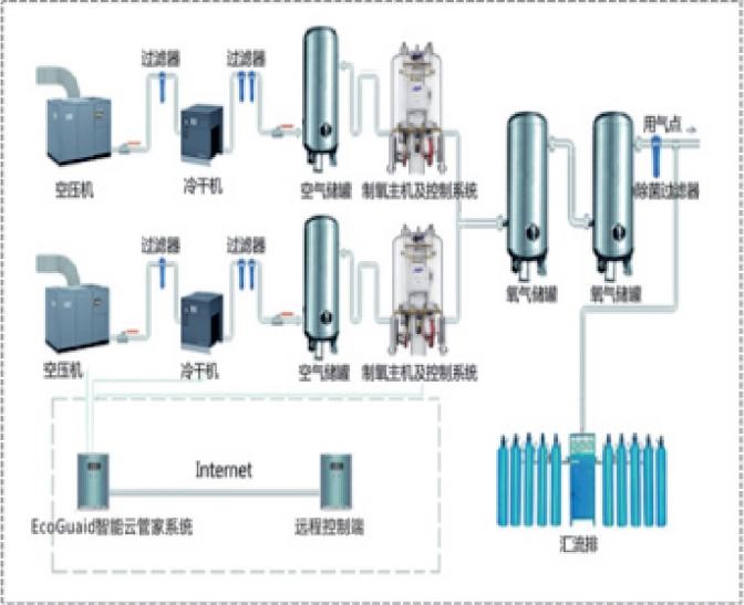 PSA制氧,是以分子篩 (molecular sieve) 為吸附劑,通過變壓吸附法(pressure swing adsorption,PSA) 以環(huán)境空氣為原料,在常溫低壓的條件下,利用分子篩加壓時(shí)對(duì)空氣中的氮?dú)猓ㄎ劫|(zhì))吸附容量增加,而空氣中的二氧化碳、氣態(tài)酸和其它氣態(tài)氧化物等,均屬于分子極性很強(qiáng)的物質(zhì),很難通過分子篩,從而使產(chǎn)出氧的氧氣純度達(dá)到93%±3%v/v以上)。