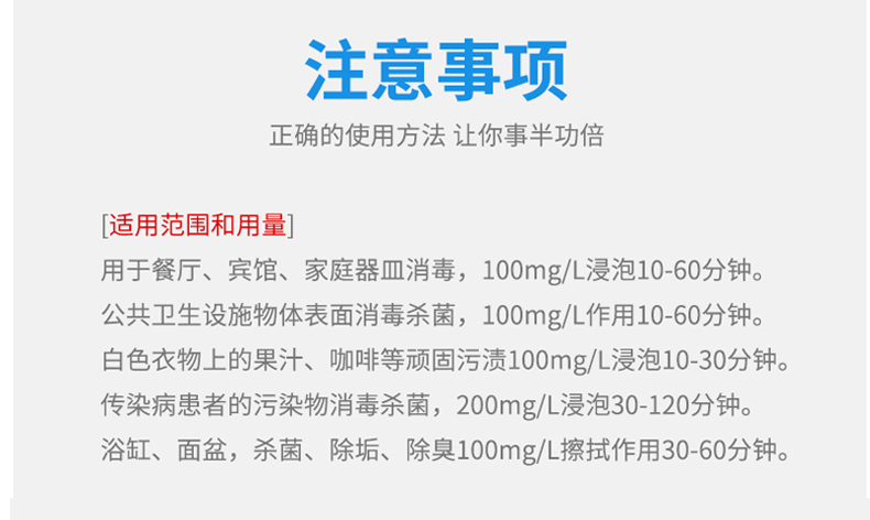 [使用范圍]用于一般物體表面織物、血液及粘液等體液污染物品、排泄物的消毒、以及瓜果蔬菜、食品加工工具和設(shè)備消毒等