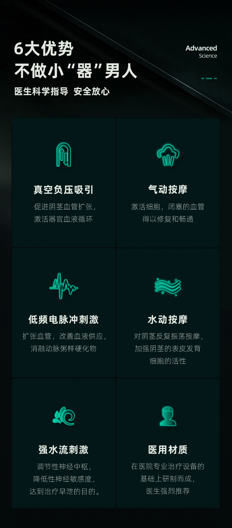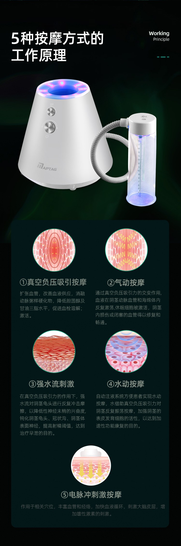 男性性功能康復(fù)治療儀是輔助治療男性性功能障礙的儀器。它集現(xiàn)代計算機(jī)技術(shù)、自動控制技術(shù)、電脈沖技術(shù)為一體。利用我國傳統(tǒng)中醫(yī)經(jīng)絡(luò)學(xué)原理與現(xiàn)代數(shù)字化電子技術(shù)相結(jié)合,具備電頻刺激、水動按摩、氣動按摩、氣泡按摩、負(fù)壓吸引等多項(xiàng)物理綜合治療模式,通過專用器具施治于人體陰莖及相關(guān)穴位,調(diào)節(jié)大腦皮層功能,興奮脊髓性中樞系統(tǒng),促進(jìn)陰莖支動脈血管擴(kuò)張,增粗陰莖海綿體的體積等,從而實(shí)現(xiàn)非器質(zhì)男性性功能障礙的康復(fù)治療和保健目的。