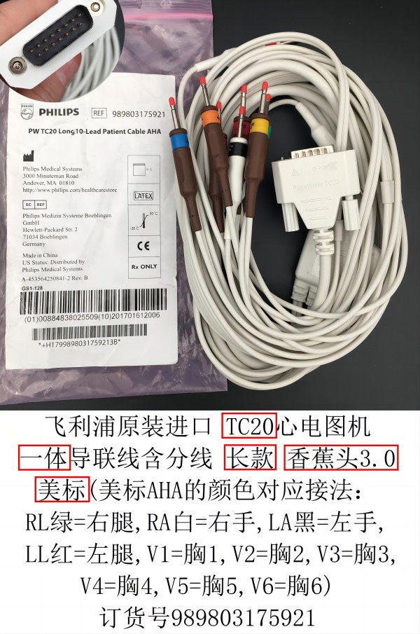飛利浦原裝進(jìn)口TC20心電圖機(jī)一體導(dǎo)聯(lián)線含分線 長款(胸導(dǎo)3.3m,上肢體導(dǎo)3.7m,下肢體導(dǎo)3.8m) 香蕉頭3.0 美標(biāo) (美標(biāo)AHA的顏色對應(yīng)接法:RL綠=右腿, RA白=右手, LA黑=左手, LL紅=左腿, V1=胸1,V2=胸2,V3=胸3,V4=胸4 ,V5=胸5,V6=胸6)訂貨號989803175921?