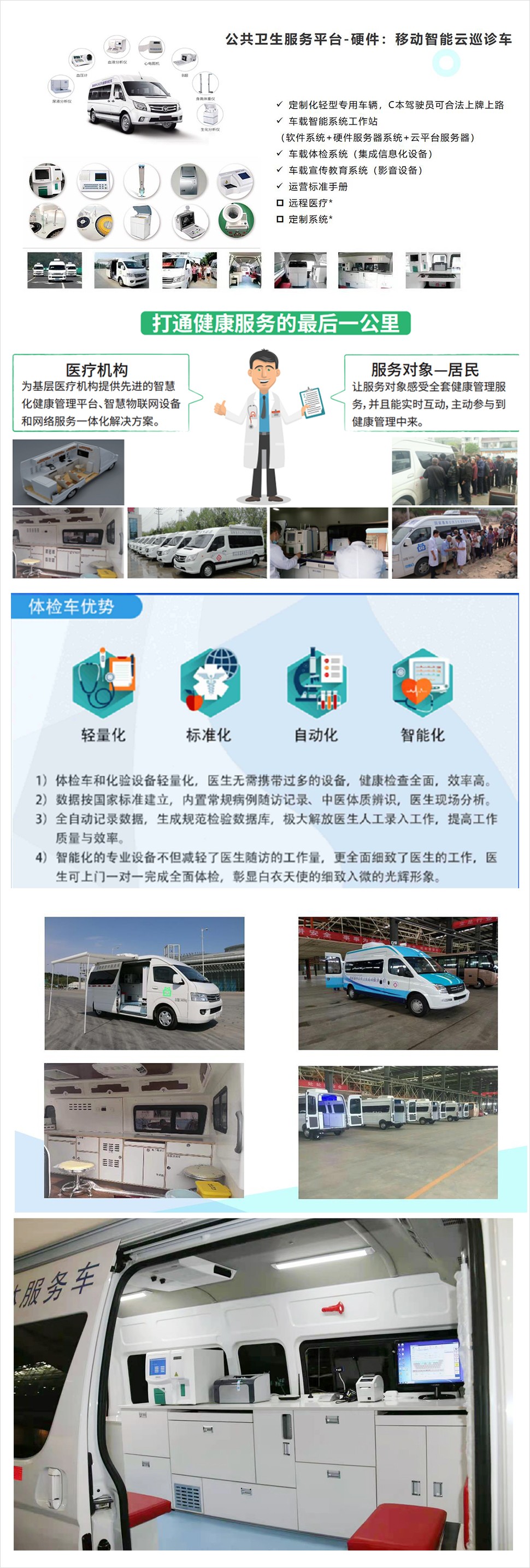 方案,把精心研制和裝配的集車輛、醫(yī)療檢測(cè)設(shè)備、信息采集和數(shù)據(jù)傳輸系統(tǒng)軟件于- -體的智慧公衛(wèi)移動(dòng)醫(yī)療體檢車。