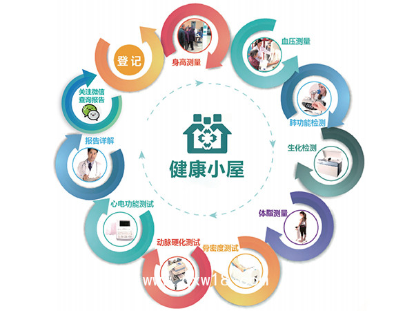 將各類健,康檢查儀器整合在一個溫馨、舒適的環(huán)境下,使受檢者可以自主選擇體檢項目,打印集成式體檢報告,自動建立健康檔