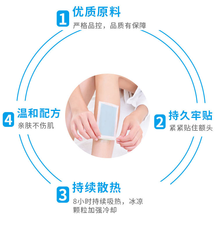 持續(xù)降熱,親膚舒適;輕松一貼,物理降溫更安心:無副作用清涼舒適,緩解疲勞,使用更安心;綠色健康不刺激:高分子凝膠,超純水,快速降溫清涼舒適;夏天輕松告別酷熱,午休時(shí)刻來一帖安心舒適休息好;安心選材,嚴(yán)格管控產(chǎn)品材質(zhì)品質(zhì)信賴,使用放心;無紡布背襯,柔軟透好散熱;薄膜覆蓋層,阻隔氣體,抑制化學(xué)反應(yīng),保持膠粘劑的儲(chǔ)存期;高分子凝膠,環(huán)保材質(zhì),粘性好,不掉膠;舒適彈力大面積彈力無紡布,舒適透氣,散熱快,保護(hù)嬌嫩肌膚。
