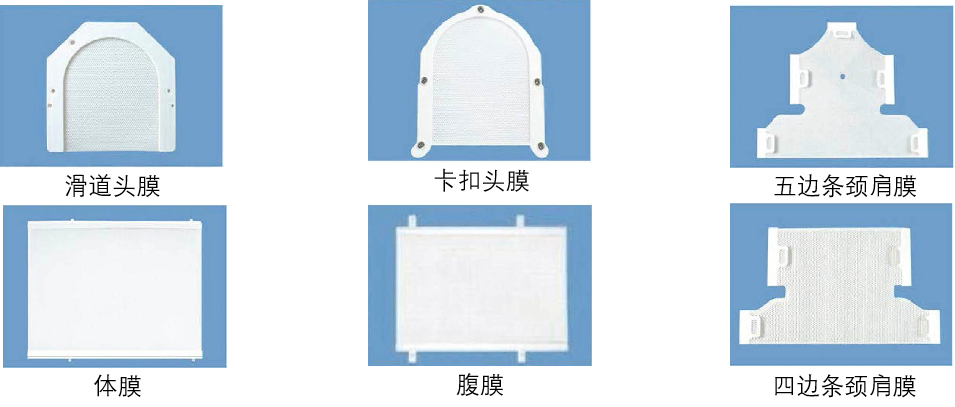 頭膜、T型頭膜、頸肩膜、頭頸肩膜、胸膜、胸腹膜、腹膜、體膜等。