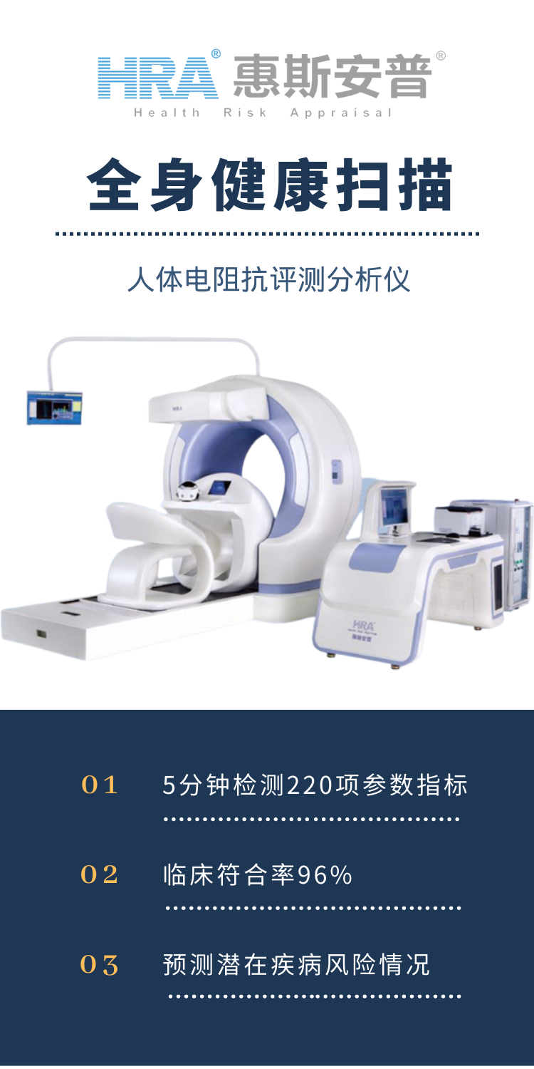 惠斯安普的HRA全生命周期健康管理醫(yī)療設(shè)備,5分鐘左右掃描全身,即可實(shí)現(xiàn)對(duì)人體整體各組織、各器官功能全面監(jiān)測(cè),并對(duì)亞健康及早期病變進(jìn)行準(zhǔn)確地評(píng)估,預(yù)測(cè)潛在的危險(xiǎn)因素及疾病發(fā)展方向,對(duì)疾病風(fēng)險(xiǎn)作出早期預(yù)警(0疼痛)