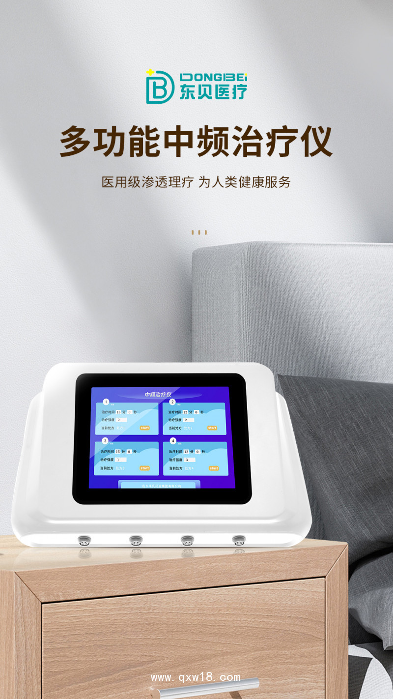 本產(chǎn)品四路輸出分別用于不同病人,采用低頻調(diào)制中頻電療法,應用頻率為2kHz的交流電(包括正弦波、脈沖波和調(diào)制波等)進行治療、康復。調(diào)制中頻的目的是利用載波為中頻電流其穿透力強的特點將調(diào)制波送入人體,以實現(xiàn)深度治療的作用。
