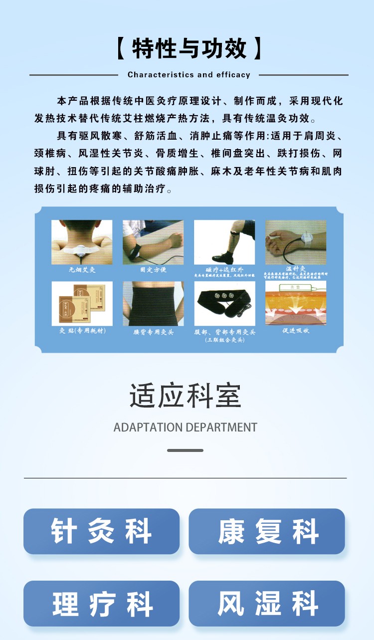 作用機(jī)理:根據(jù)傳統(tǒng)中醫(yī)灸療原理。結(jié)合現(xiàn)代微電子發(fā)熱、磁療等技術(shù),并廣泛征詢國(guó)內(nèi)著名針灸學(xué)、中醫(yī)工程學(xué)、電子學(xué)、結(jié)構(gòu)設(shè)計(jì)、藥物制劑等專家意見(jiàn),而發(fā)明的新型灸療設(shè)備。它實(shí)現(xiàn)了智能操作、控溫控時(shí)、無(wú)煙無(wú)火、定向?qū)?、多穴位同灸等功能,具備傳統(tǒng)艾柱灸、艾條灸的功效,可實(shí)施直接灸、間接灸、溫針灸等一系列灸法,并彌補(bǔ)了傳統(tǒng)艾灸煙霧大、易燙傷、操作費(fèi)力等不足、是艾灸現(xiàn)代化的精品。