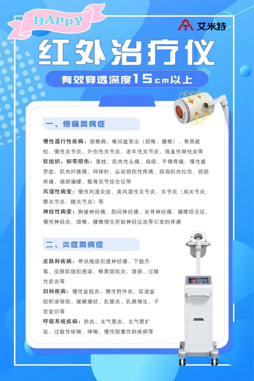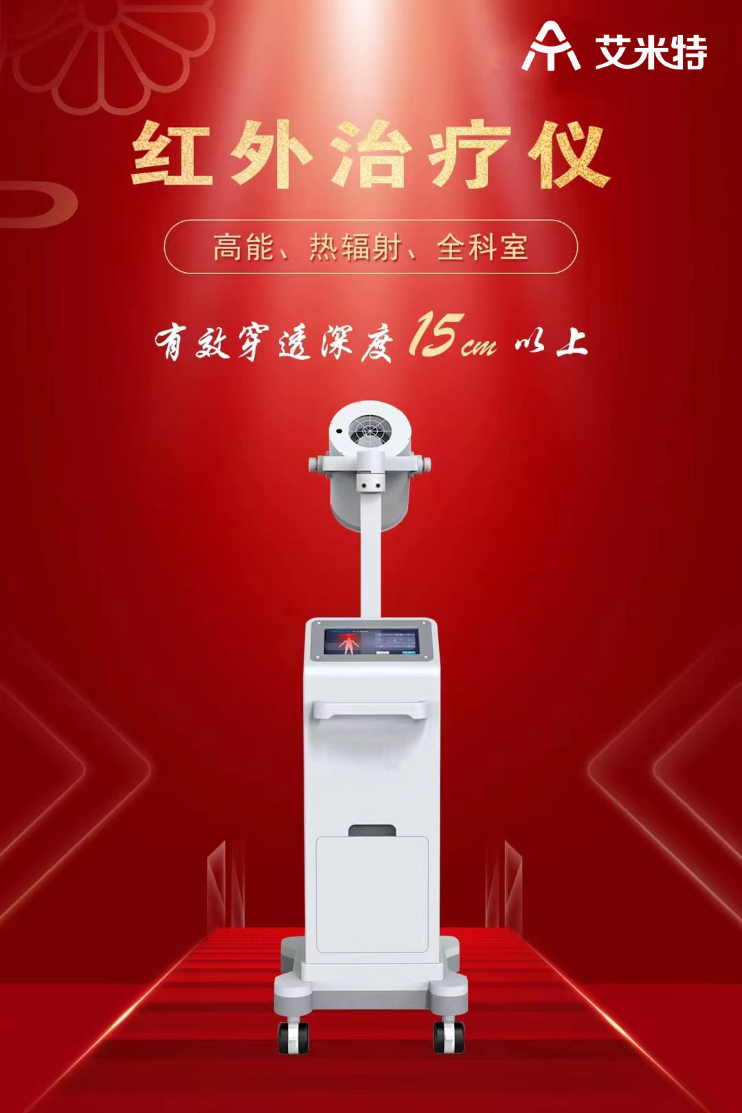 紅外線治療儀,以進口鹵素光源為發(fā)光體,通過特制作用的過濾系統(tǒng),濾除其中對皮膚致熱性強的波段,保留人體能夠耐受,并具治療價值的高能量光波(760nm~1400nm),有效作用深度輕松達到10cm以上,適用于深層疼痛、炎癥、組織損傷、腔體積液等相關疾病。