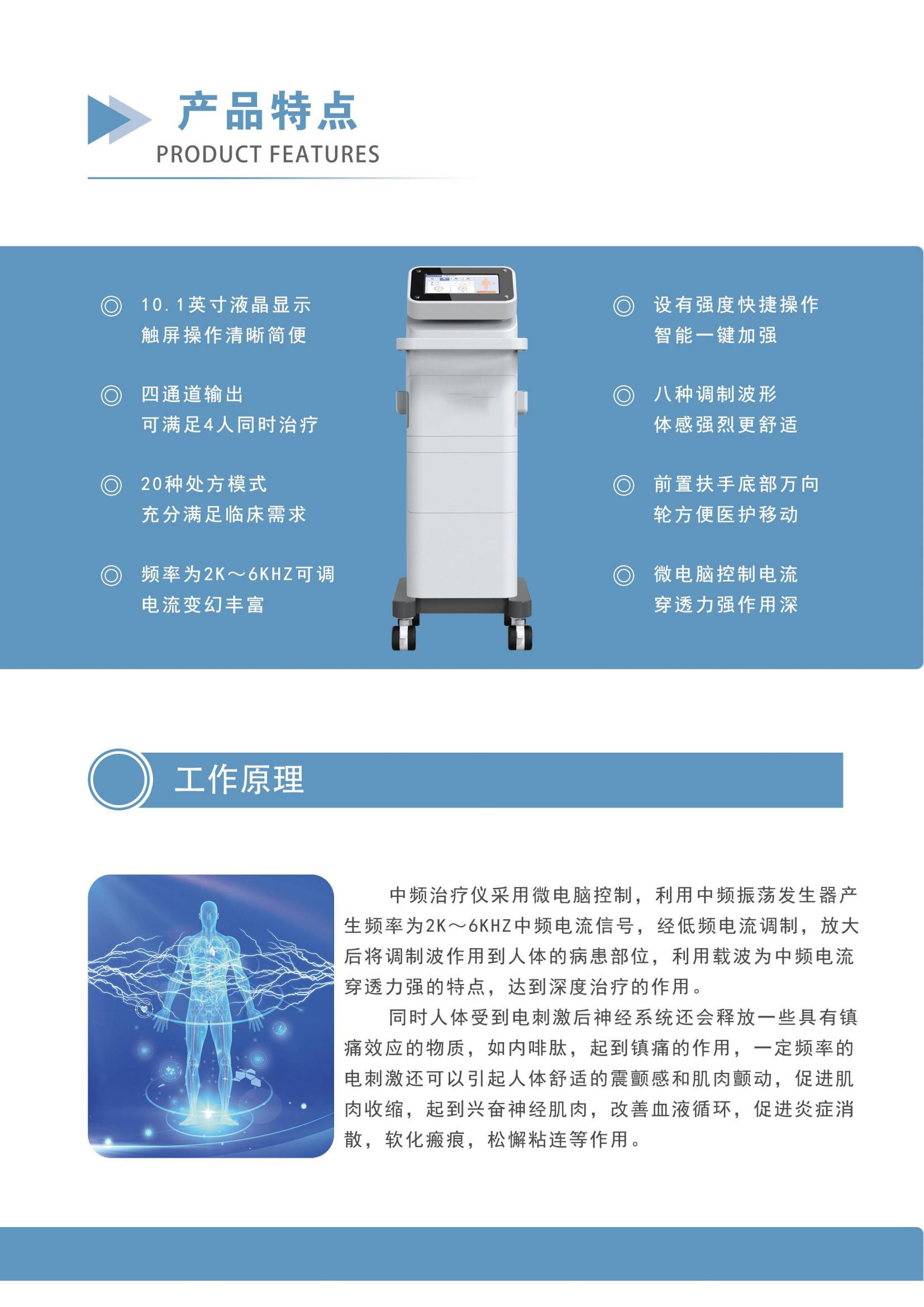 工作原理:采用微電腦控制,由中頻振蕩發(fā)生器產(chǎn)生頻率為2kHz~6kHz中頻電流信號,經(jīng)低頻電流調(diào)制,放大后將調(diào)制波作用到人體的病患部位,利用載波為中頻電流穿透力強的特點,達到深度治療的作用。