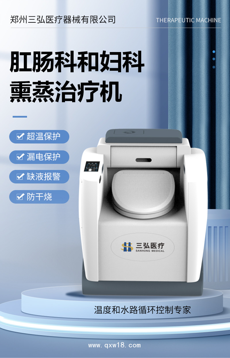 由三弘醫(yī)療自主研發(fā)生產(chǎn)的肛腸熏蒸治療機是我公司根據(jù)傳統(tǒng)中醫(yī)熏蒸理論,結(jié)合現(xiàn)代科學技術研發(fā)而成的最新一代中藥熏蒸設備,具有超溫保護、漏電保護、缺液報警、防干燒等多重防護措施。在蒸氣發(fā)生器中加入藥液或草藥,通過智能化的控制系統(tǒng)氣化藥液分子,藥蒸汽在藥力熱力的作用下作用于治療儀部位,達到治病的目的。