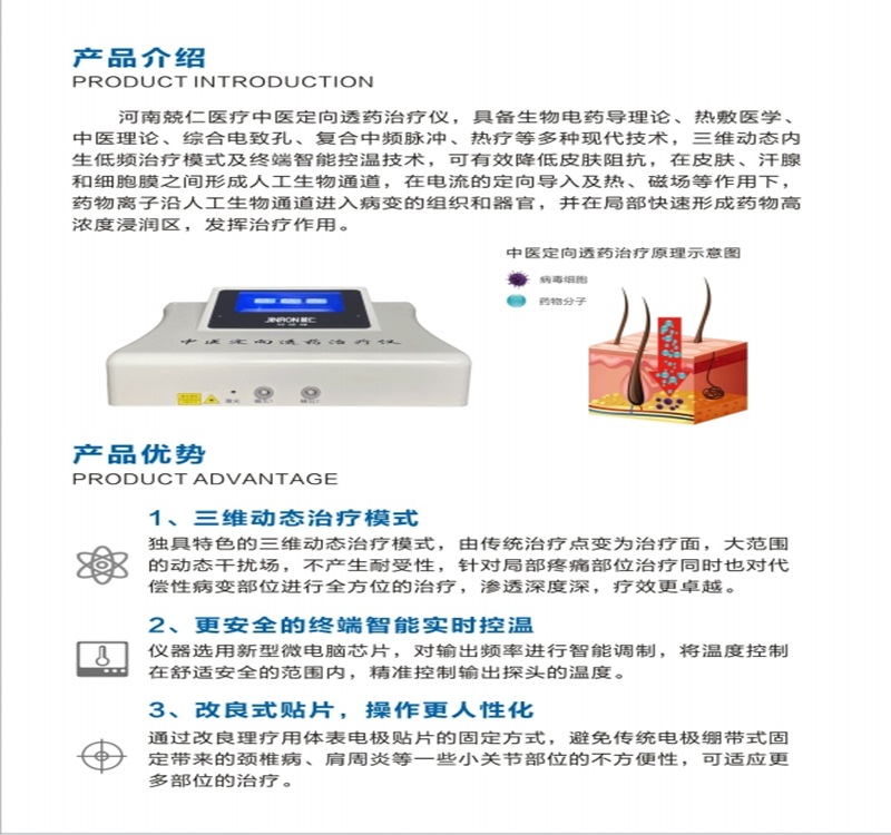 河南兢仁醫(yī)療中醫(yī)定向透藥治療儀,具備生物電藥導(dǎo)理論、熱敷醫(yī)學(xué)、中醫(yī)理論、綜合電致孔、復(fù)合中頻脈沖、熱療等多種現(xiàn)代技術(shù),三維動態(tài)內(nèi)生低頻治療模式及終端智能控溫技術(shù),可有效降低皮膚阻抗,在皮膚、汗腺和細(xì)胞膜之間形成人工生物通道,在電流的定向?qū)爰盁帷⒋艌龅茸饔孟拢幬镫x子沿人工生物通道進(jìn)入病變的組織和器官,并在局部快速形成藥物高濃度浸潤區(qū),發(fā)揮治療作用。