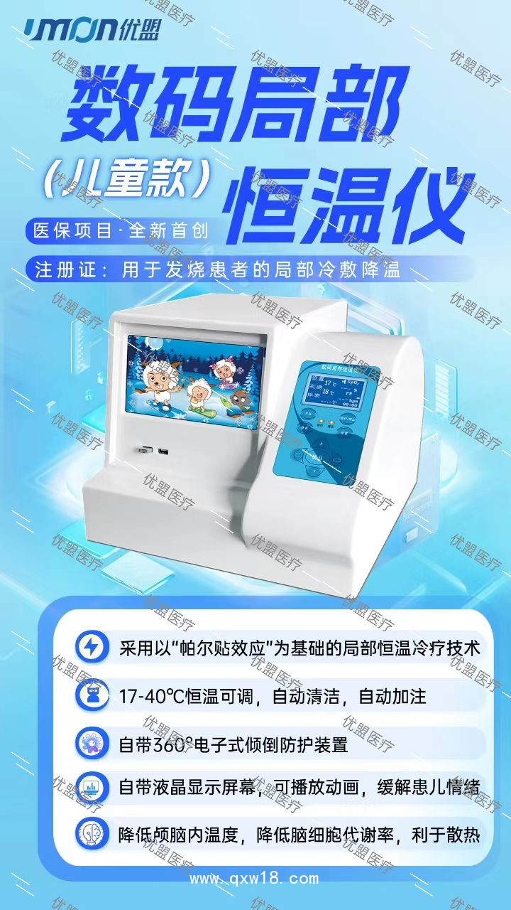 原理: 數(shù)碼局部恒溫儀系列產(chǎn)品采用半導(dǎo)體換能(帕爾貼效應(yīng))物理降溫技術(shù)并實(shí)時(shí)監(jiān)測(cè)血氧飽和度、脈搏、體溫等生命體征、有效控制腦溫。 特點(diǎn): 1.采用半導(dǎo)體換能(帕爾貼效應(yīng))物理降溫技術(shù)。 2.具有脈搏、血氧、體溫等生命體征監(jiān)測(cè)功能。 3.恒溫可調(diào)、降溫速度快。 4.設(shè)備采用傾倒防護(hù)、智能檢測(cè)雙重保護(hù)。 5.聲光自動(dòng)報(bào)警,智能化控制。 6.配備單水位自測(cè)制冷系統(tǒng)。 7.具有手動(dòng)清洗功能。 適用范圍 1.適用科室 兒科、新生兒科、急診科等有發(fā)熱病人的臨床科室。 2、適用癥 主要用于發(fā)熱、腦部疾病的局部物理降溫和生命體征監(jiān)測(cè)。