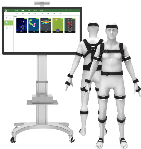 產品特點:大型觸摸屏顯示多達15個無線穿戴智能傳感器實時捕捉檢測全身關節(jié)活動度系統(tǒng)內置幫助圖文指導標準化康復訓練操作