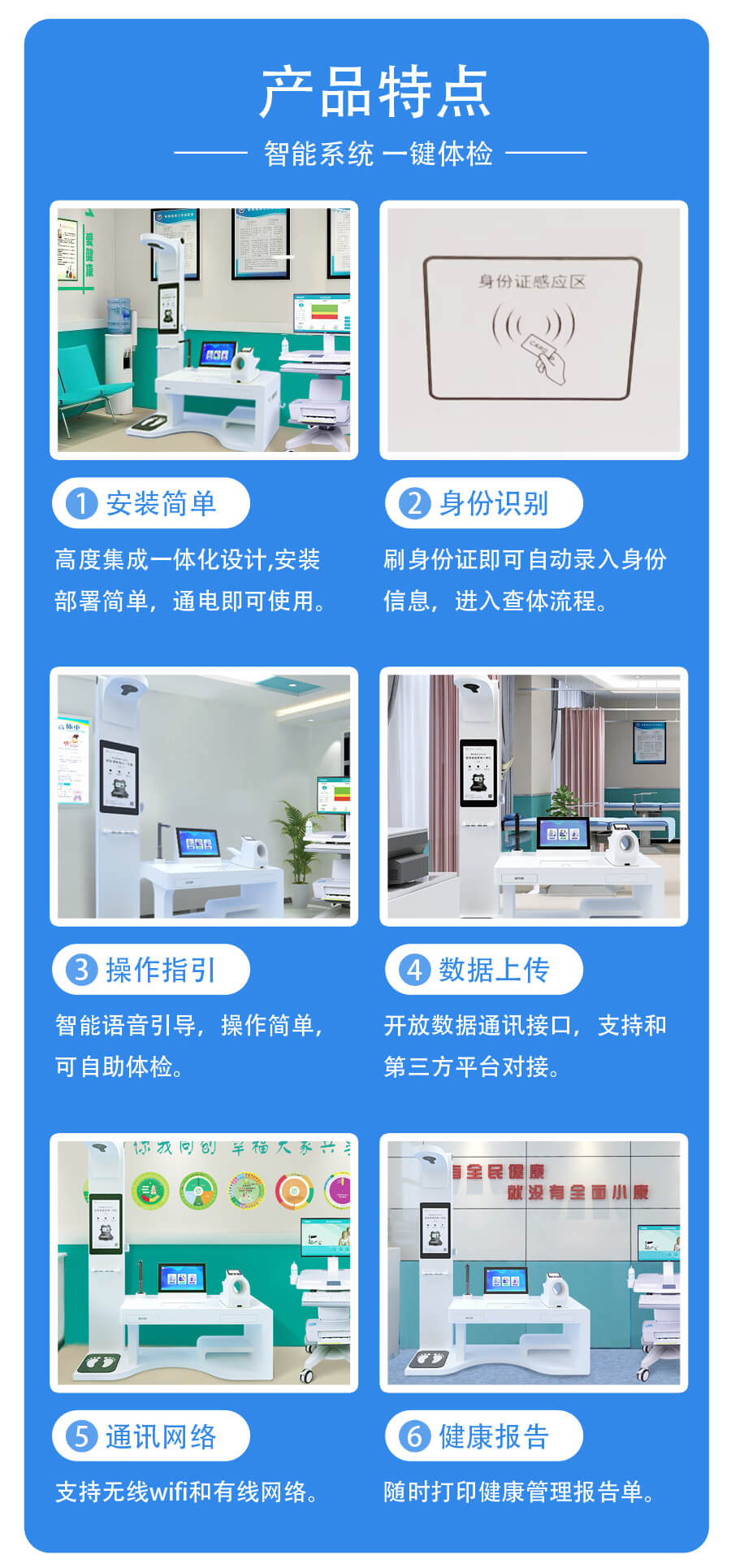 互動性強(qiáng):上正華瑞健康管理工作站配備有多媒體交互界面,居民可以通過觸摸屏了解健康知識和養(yǎng)生方法。同時,上正華瑞健康管理工作站還能與智能手機(jī)等設(shè)備連接,方便居民隨時查看自己的體檢報告和健康狀況,增強(qiáng)居民的健康管理意識。