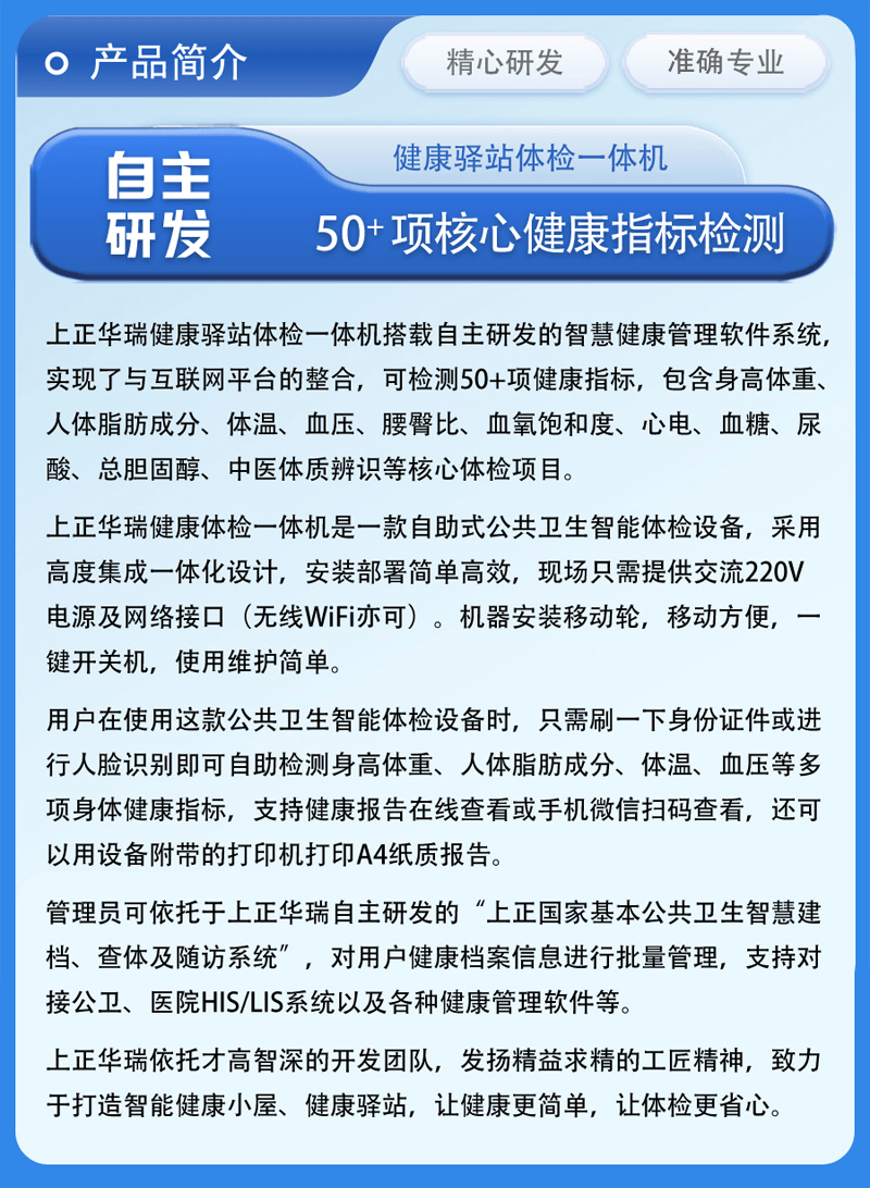 使用上正華瑞健康自測一體機開展老年人健康體檢活動的功能優(yōu)勢主要體現(xiàn)在以下幾個方面: