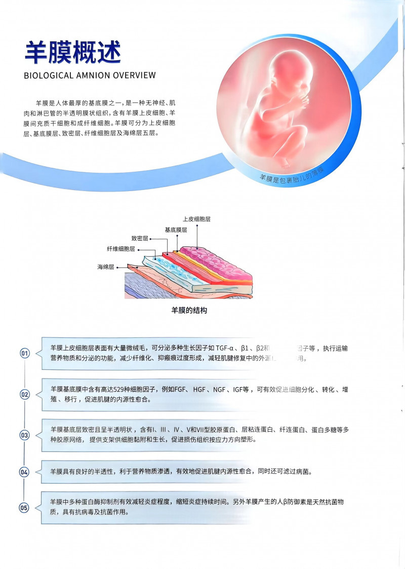 羊膜具有良好的半透性,利于營養(yǎng)物質(zhì)滲透,有效地促進肌腱內(nèi)源性愈合,同時還可濾過病菌。