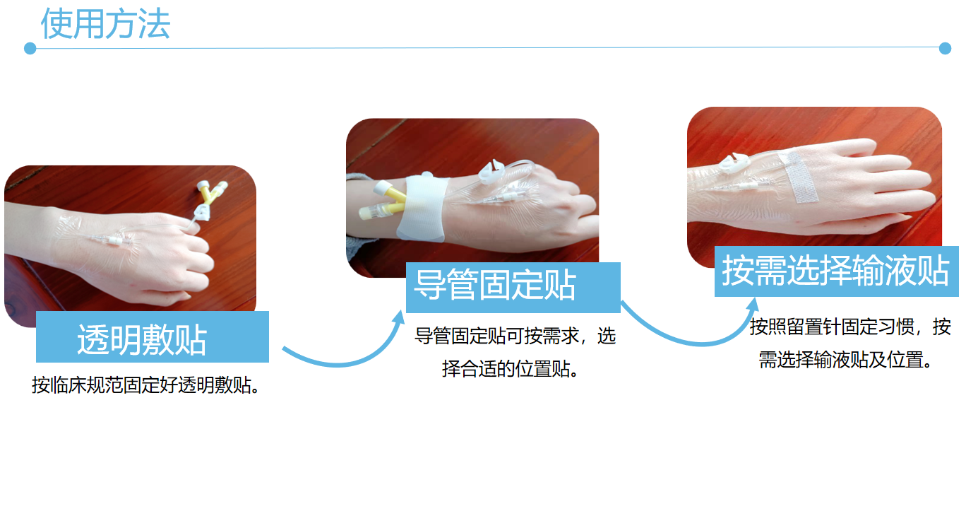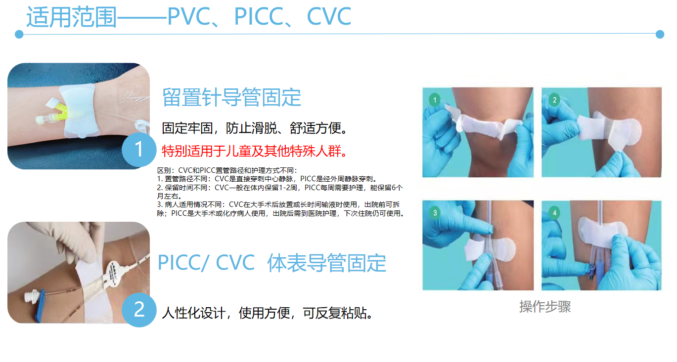 適用范圍:可用于留置針、引流管、PICC、CVC、導(dǎo)尿管、鼻飼管、透析導(dǎo)管等各種導(dǎo)管的固定