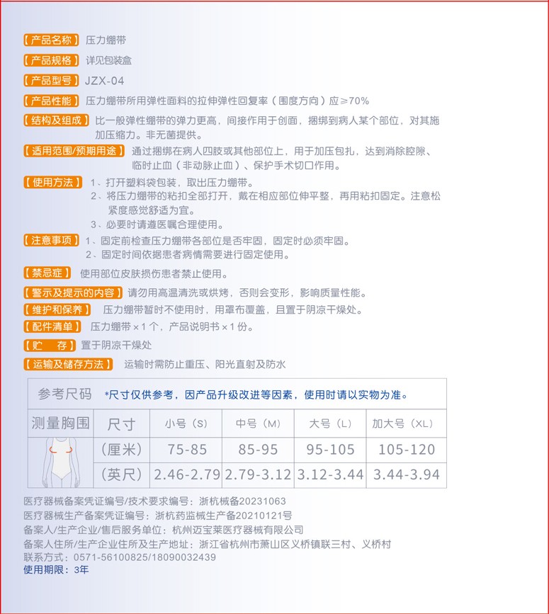 [適用范圍/預期用途]通過捆綁在病人四肢或其他部位上,用于加壓包扎,達到消除腔隙、臨時止血(非動脈止血)、保護手術(shù)切口作用。