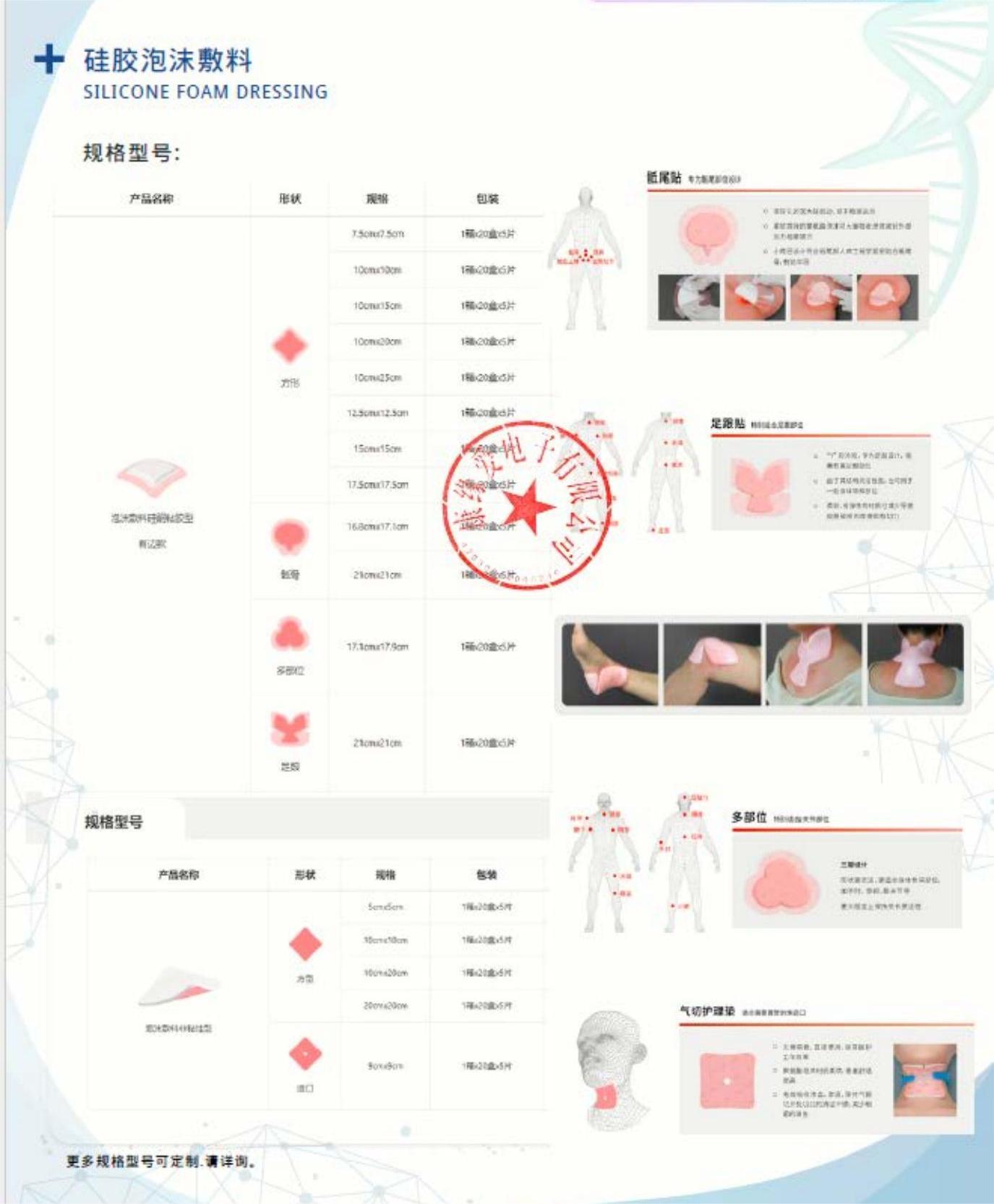 • 產(chǎn)品賣點(diǎn): 硅凝膠泡沫敷料由聚氨酯PU膠帶、聚氨酯泡沫、自粘性硅膠膠帶、PP離型膜制作而成,其中聚氨酯PU膠帶為涂醫(yī)用壓敏膠的聚氨酯薄膜,自粘性硅膠膠帶為涂醫(yī)用壓敏膠和硅凝膠的聚氨酯薄膜,離型膜為涂硅油防粘劑的PP膜;所含成分不可被人體吸收,環(huán)氧乙烷滅菌,一次性使用。
