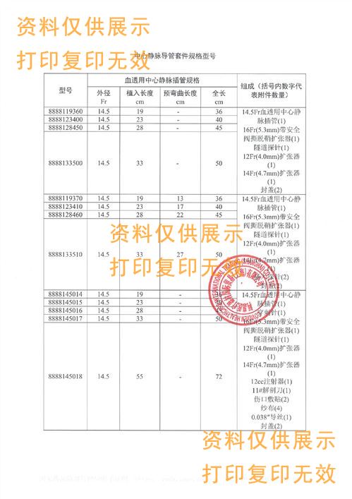 ? ? ? ?本產(chǎn)品包括:血透用中心靜脈插管、導(dǎo)絲、擴(kuò)張器、穿刺針、隧道探針、傷口敷貼、注射器、封蓋、解剖刀等。血透用中心靜脈插管管體采用聚氨酯制成:導(dǎo)絲和穿刺針由304不銹鋼制成,隧道探針由303不銹鋼制成:擴(kuò)張器采用高密度聚乙烯材料:傷口敷貼由聚酯薄膜和棉線制成。產(chǎn)品為一次性使用,環(huán)氧乙烷滅菌。留置中心靜脈后可持久使用(可大于30天)。