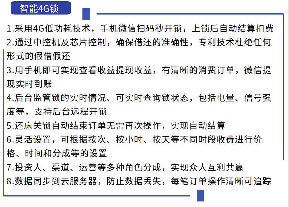 Ⅰ 數(shù)據(jù)傳輸穩(wěn)定,上鎖自動(dòng)結(jié)束訂單.Ⅱ 一控多,一個(gè)主板控制多個(gè)鎖頭,高度集成,