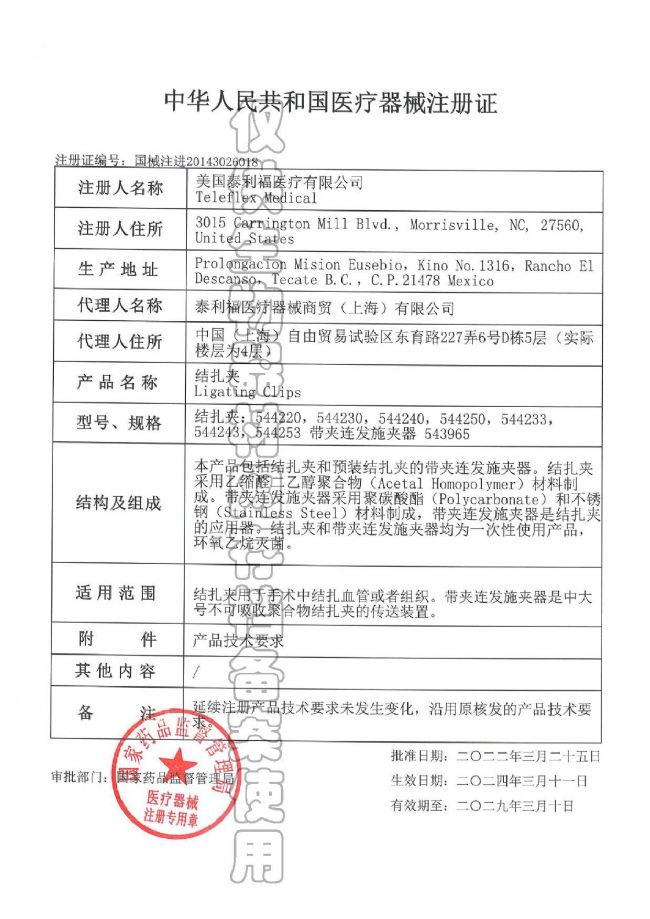 產(chǎn)品包括結(jié)扎夾和預(yù)裝結(jié)扎夾的自動結(jié)扎鉗。結(jié)扎夾采用乙縮醛二乙醇聚合物(Acetal Homopolymer)材料制成。自動結(jié)扎鉗采用聚碳酸酯(Polycarbonate)和不銹鋼(Stainless Steel)材料制成,自動結(jié)扎鉗是結(jié)扎夾的應(yīng)用器。結(jié)扎夾和自動結(jié)扎鉗均為一次性使用產(chǎn)品,環(huán)氧乙烷滅菌
