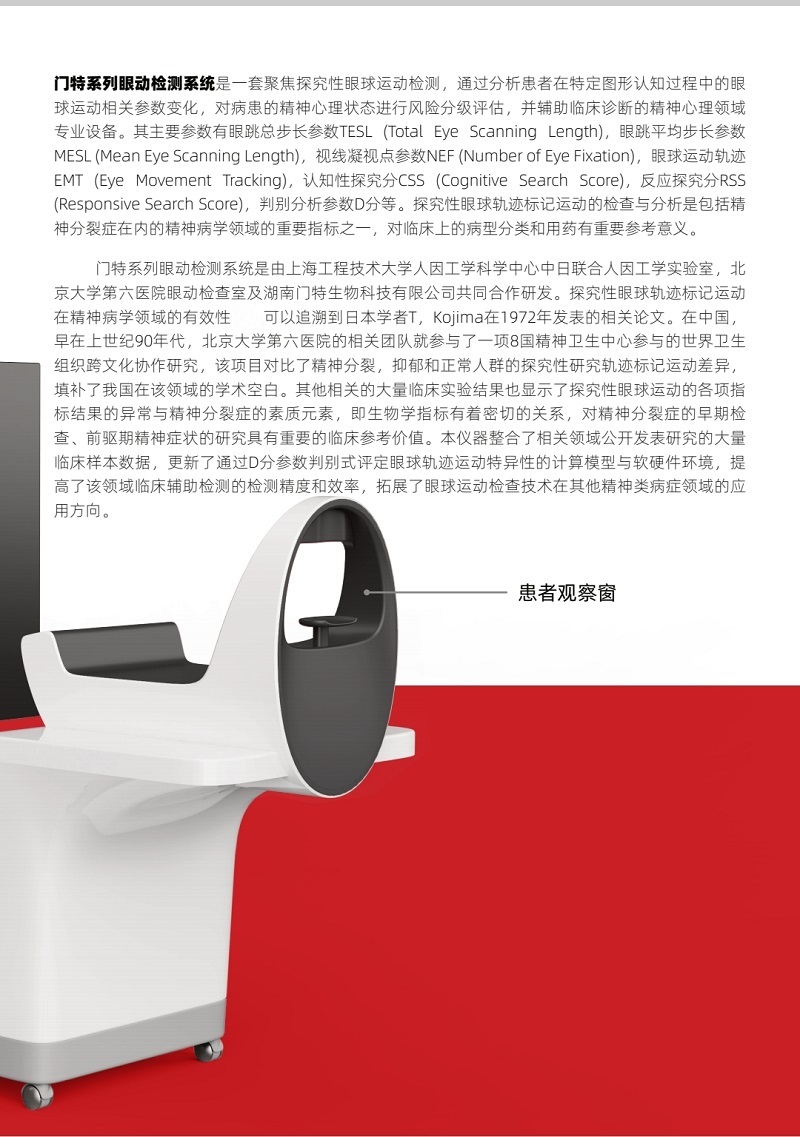 用于記錄眼球活動軌跡和瞳孔大小變化,可用于精神分裂癥、阿爾茨海默病的早期篩選和輔助診斷。