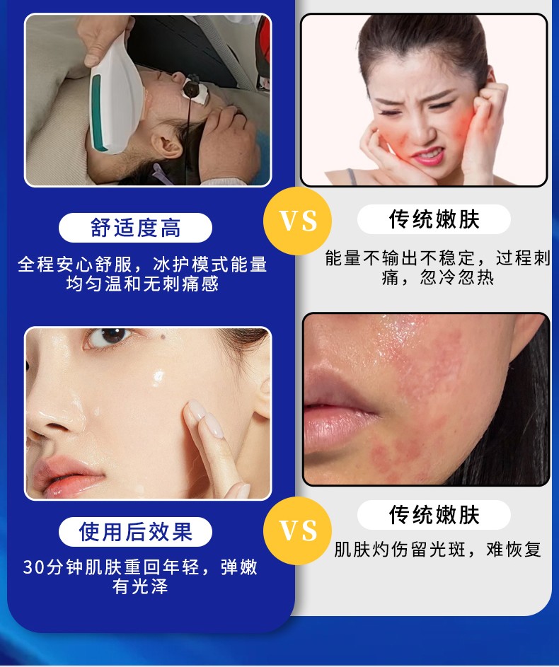5、嫩膚:當(dāng)強脈沖光作用于皮膚上時,皮膚會通過吸收光產(chǎn)生大量的熱, 使皮下達到45 -- 60度,從而促進膠原蛋白再生,膠原纖維收緊,同時也可以促進血液循環(huán),改善面色暗黃、收細毛孔、緊致肌膚。