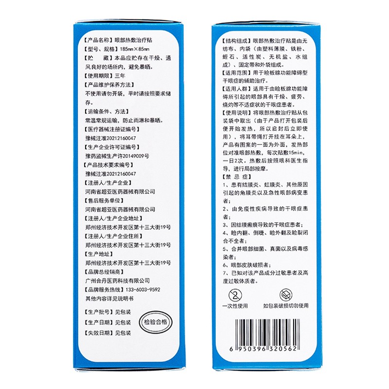 【使用說明】將眼部熱敷治療貼從包裝袋中取出(由于產(chǎn)品打開包裝后便開始發(fā)熱,所以啟封后立即使用),將耳帶繩打開掛在耳朵上,產(chǎn)品有圖案的一面為外面,發(fā)熱部位對準眼部熱敷,每次貼敷15min,一日2次。熱敷后按照眼科醫(yī)生指導(dǎo),進行局部按摩。